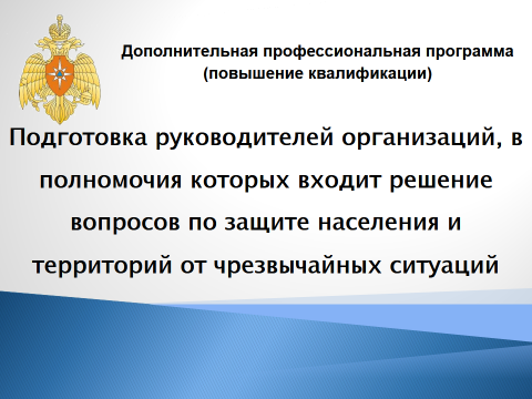 «ПОДГОТОВКА РУКОВОДИТЕЛЕЙ ОРГАНИЗАЦИЙ, В ПОЛНОМОЧИЯ КОТОРЫХ ВХОДИТ РЕШЕНИЕ ВОПРОСОВ ПО ЗАЩИТЕ НАСЕЛЕНИЯ И ТЕРРИТОРИЙ ОТ ЧРЕЗВЫЧАЙНЫХ СИТУАЦИЙ»