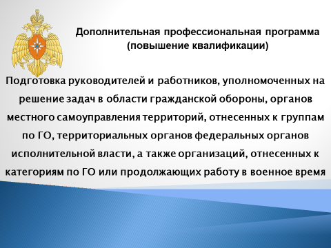 "ПОДГОТОВКА РУКОВОДИТЕЛЕЙ И РАБОТНИКОВ, УПОЛНОМОЧЕННЫХ НА РЕШЕНИЕ ЗАДАЧ В ОБЛАСТИ ГРАЖДАНСКОЙ ОБОРОНЫ, ОРГАНОВ МЕСТНОГО САМОУПРАВЛЕНИЯ ТЕРРИТОРИЙ, ОТНЕСЕННЫХ К ГРУППАМ ПО ГО, ТЕРРИТОРИАЛЬНЫХ ОРГАНОВ ФЕДЕРАЛЬНЫХ ОРГАНОВ ИСПОЛНИТЕЛЬНОЙ ВЛАСТИ, А ТАКЖЕ ОРГАНИЗАЦИЙ, ОТНЕСЕННЫХ К КАТЕГОРИЯМ ПО ГО ИЛИ ПРОДОЛЖАЮЩИХ РАБОТУ В ВОЕННОЕ ВРЕМЯ"